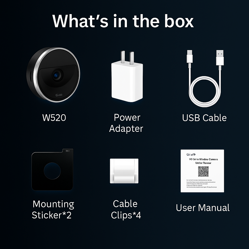 Install the Girafit W520 in just one minute—no tools, no hassle. Clean your window, apply the mounting sticker, power on, and snap the camera in place. From box to full protection in five simple steps.