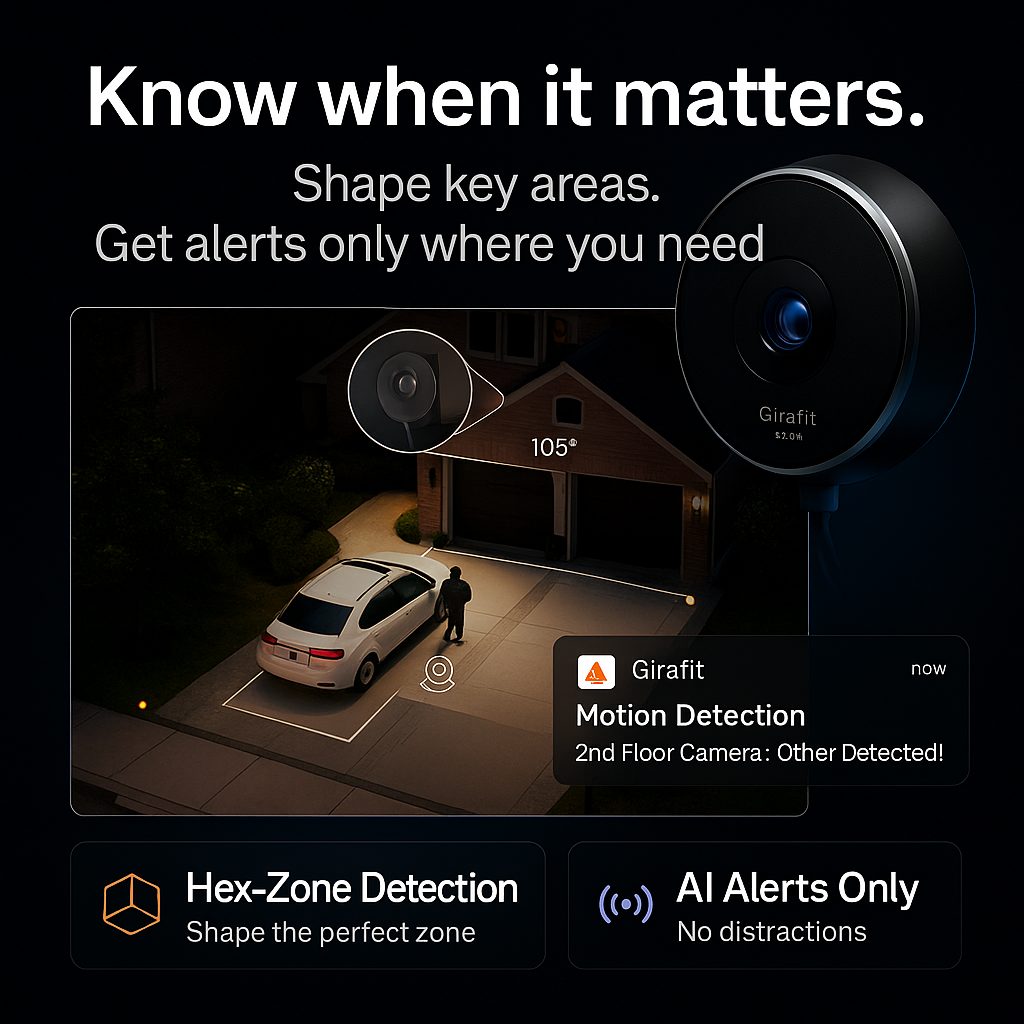 With Girafit’s Hex-Zone Detection, you decide exactly where to focus—porch, driveway, or garden curve—and get alerts only when it truly matters. AI-powered motion detection filters out distractions like pets or swaying trees, ensuring you’re notified only of real threats. No false alarms. No wasted moments. Just precision security, always one step ahead.