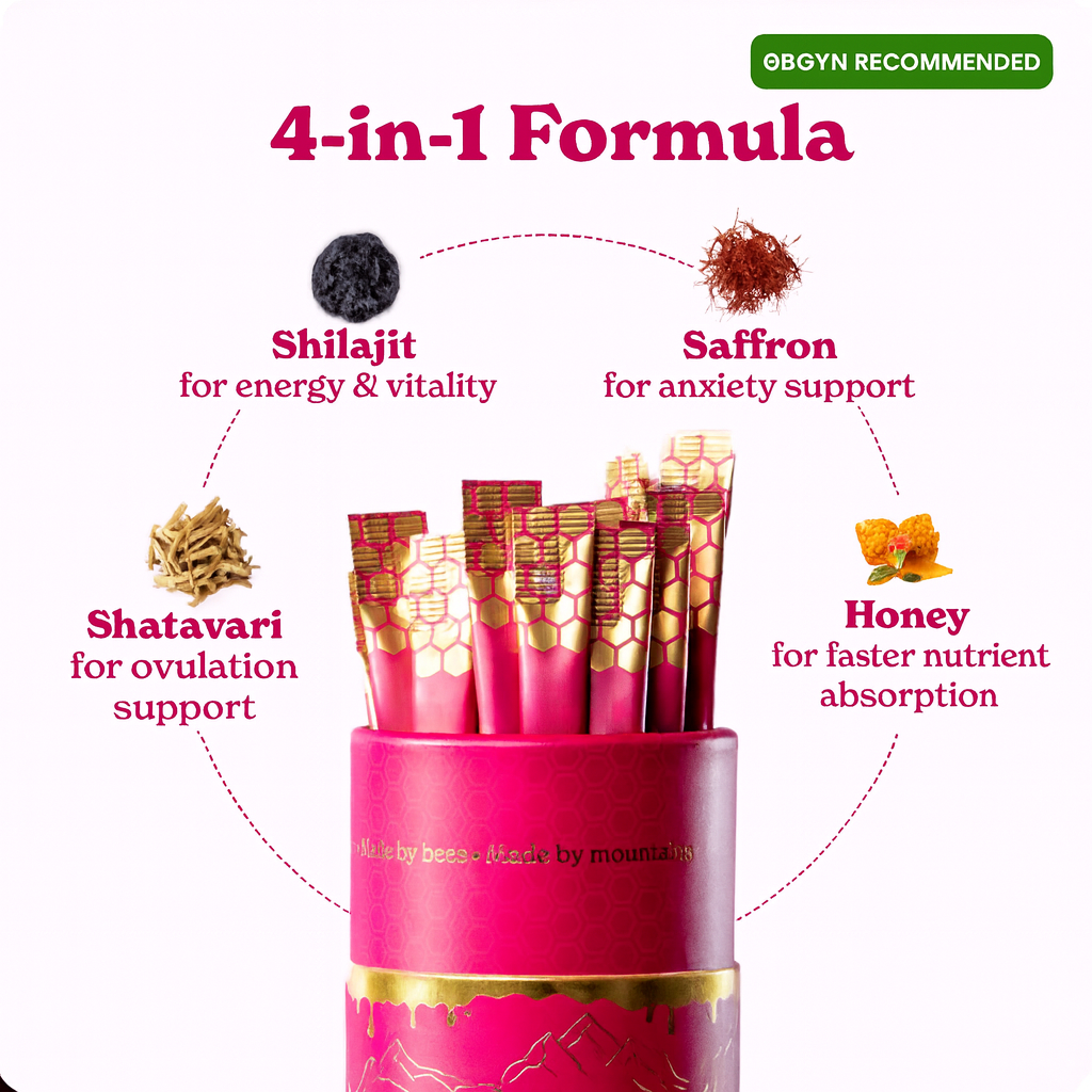 Each Honey Stick blends mineral-rich Shilajit with adaptogenic herbs to nourish your body, fuel your focus, and help you feel more in tune with yourself. Our powerful 4-in-1 formula combines 300mg of pure Himalayan Shilajit, hormone-balancing Shatavari, mood-supporting Saffron, and raw organic honey-crafted to restore natural energy, balance hormones, uplift your mood, and reignite the confident, vibrant woman within. Delicious, travel-friendly, and made to empower you— inside and out.