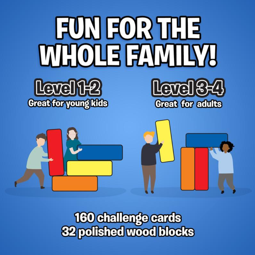The colorful blocks and quick-pick challenge cards make it easy for kids to join in, while tougher levels keep adults fully hooked too.